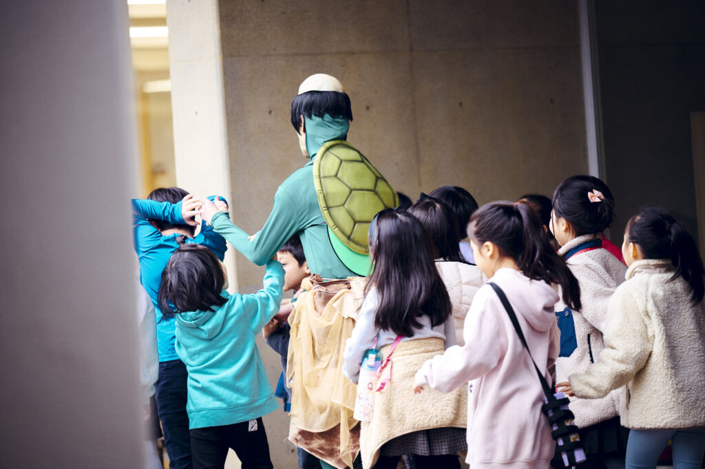 作品が始まる前はじっと座って静かにしていた児童のみなさんは、「たぬ平太」が「こんにちは!」と呼び掛けて登場したとたん、わっと盛り上がって反応を返した。