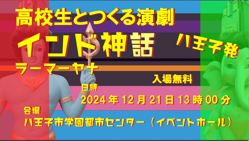 『ラーマーヤナ』ってなに? 『ラーマーヤナ』は、古代インドの大長編叙事詩。いわゆる「英雄物語」「冒険譚」です。同じ古代インドの『マハーバーラタ』も有名です。 インド神話というと、日本人にはあまり馴染みがないように感じるか … 続きを読む 【12/21(土)上演】高校生とつくるインド神話『ラーマーヤナ』を観に行こう!