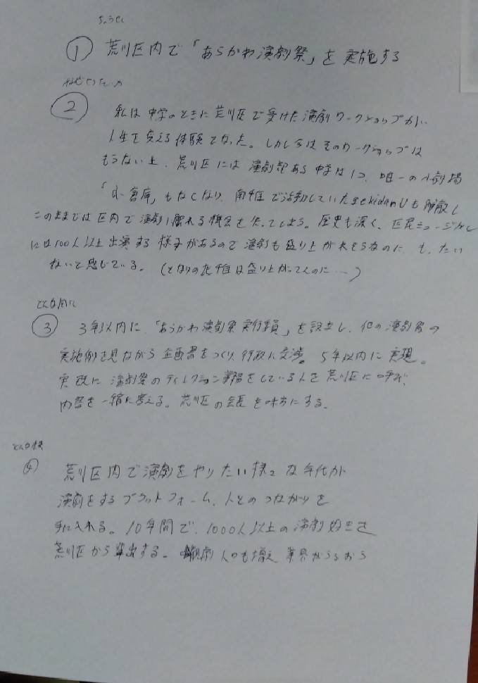 心にしまっていながらもいつか実現したいと思っていた企画「あらかわ演劇祭」について意見をもらえたことが嬉しかったです。誰かに見せた回数だけ、企画の実現可能性は上がっていくことを実感しました。(関口真生・大学三年生)